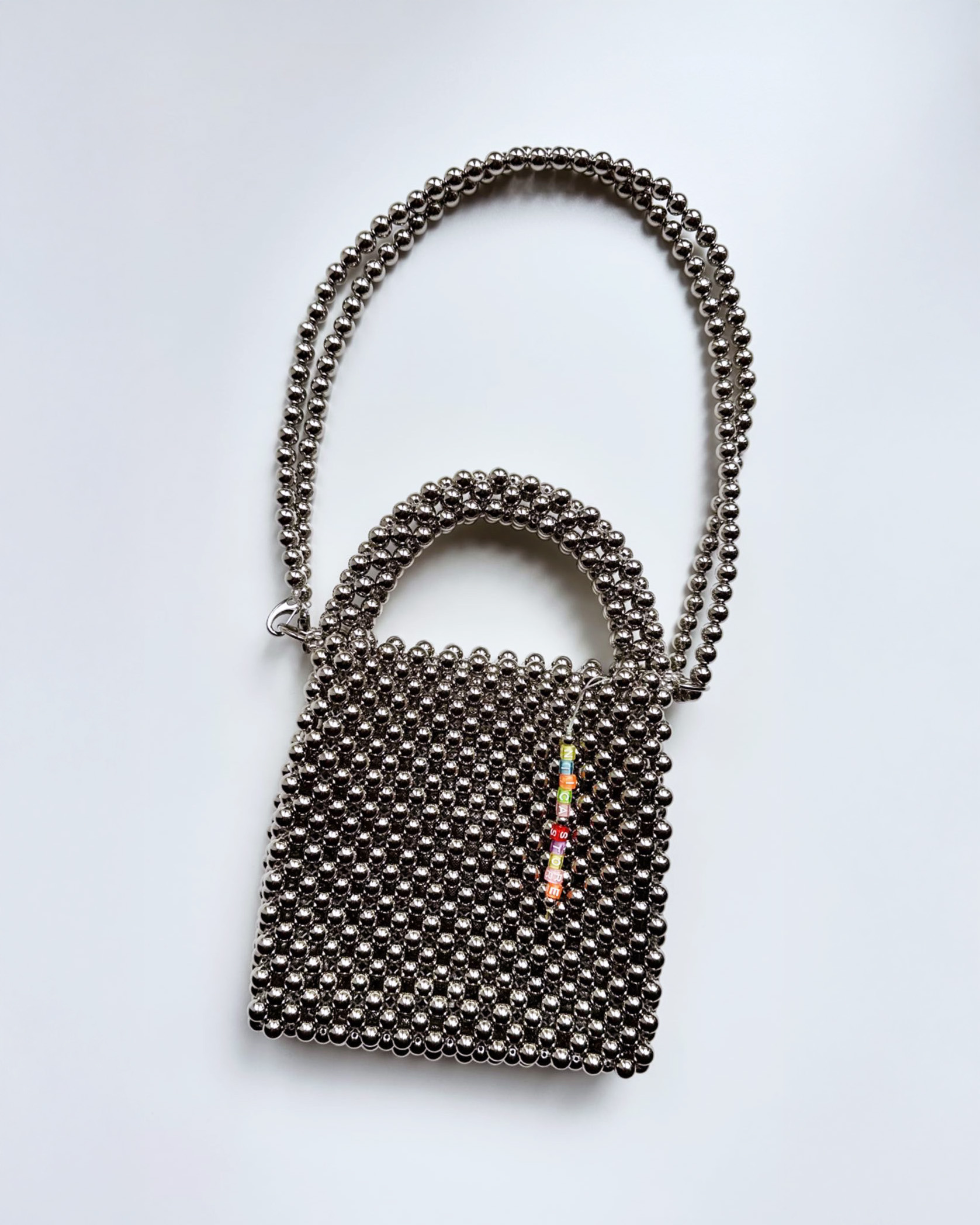 The Niica Dolphin Silver Bag is handmade in Portugal with silver acrylic beads in one size of the bag have a draw of a dolphin in shades of blue, it has a small hand strap and a larger adjustable one that can be use in different ways: crossbody, shoulder bag, as a belt.